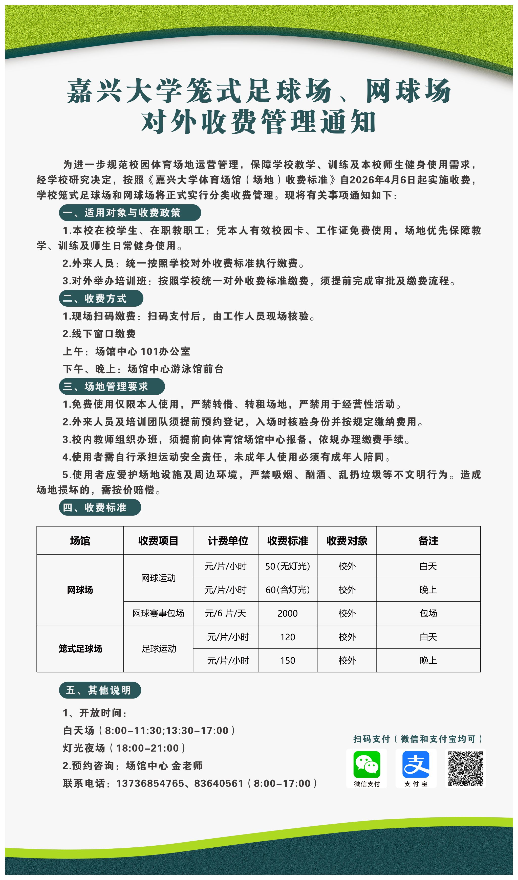 嘉兴大学笼式足球场、网球场对外收费管理通知