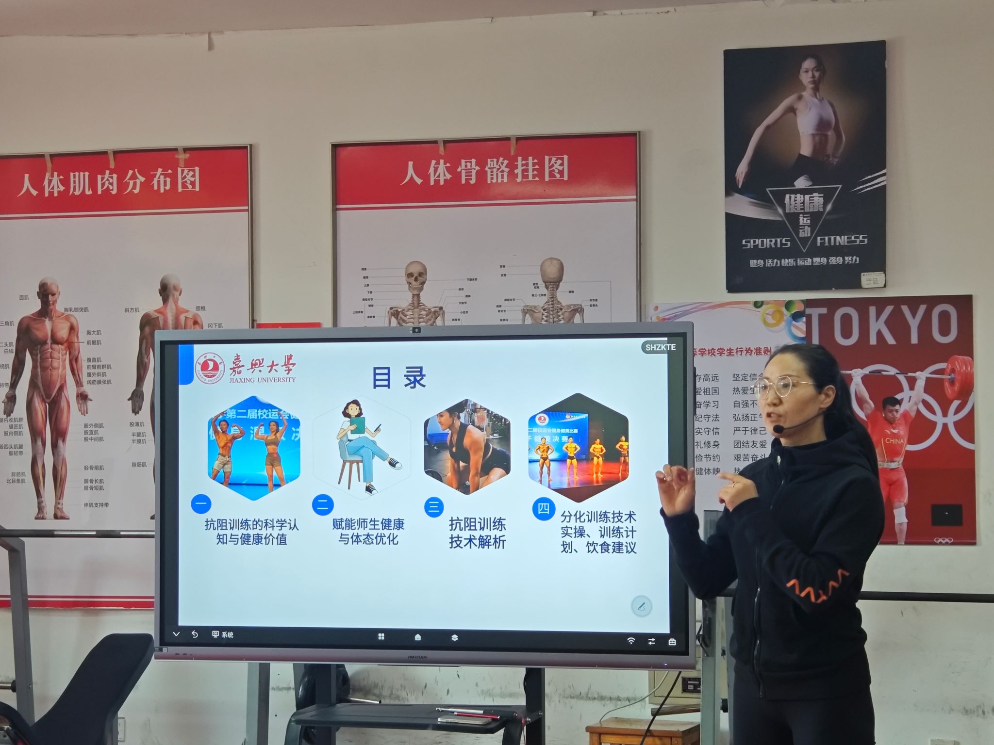 沙龙活动中,杨月红详细阐释了抗阻训练的定义、分类及核心原理。杨老师针对师生群体高频出现的视力损伤、脊柱曲度异常、骨盆前倾、肩颈劳损等健康困扰,聚焦抗阻训练的实用价值,分享涵盖胸肌、肩部、背部、臀腿等七大肌群的专项训练方法,详细介绍了自由重量、固定器械、自重、弹性阻力四类训练形式的动作要点与适用场景。为确保训练科学性与可操作性,活动还提供了差异化训练计划与饮食指导。